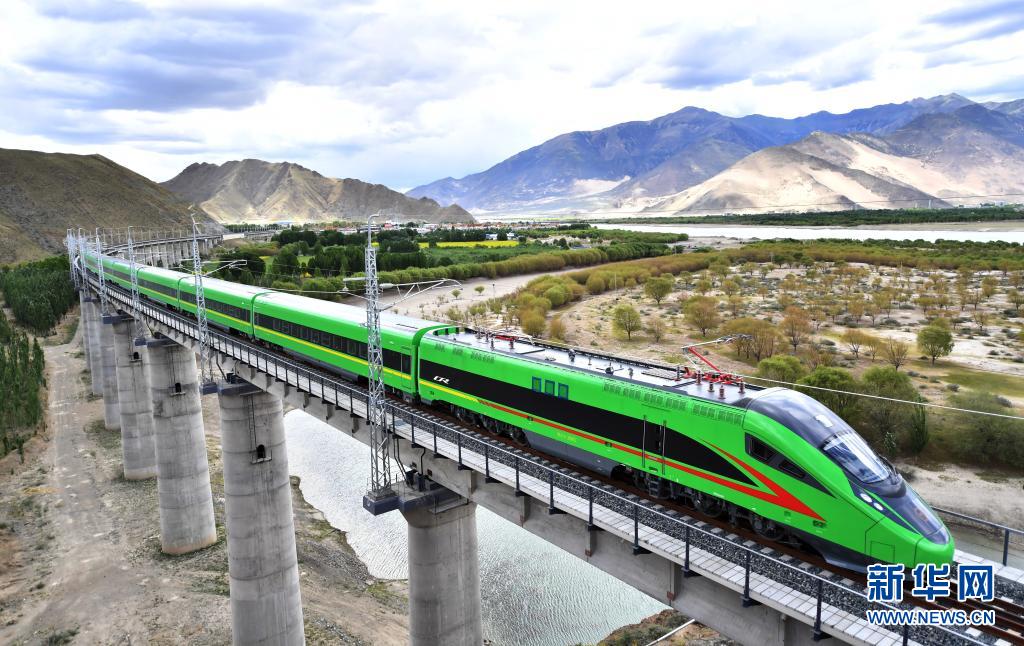 這是6月16日拍攝的行駛在拉林鐵路上的復興號列車。