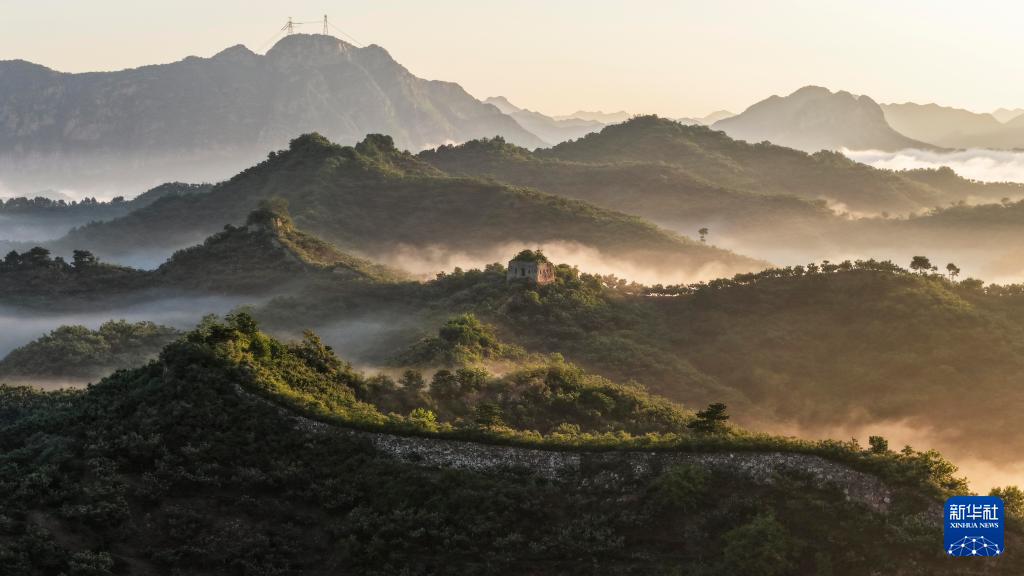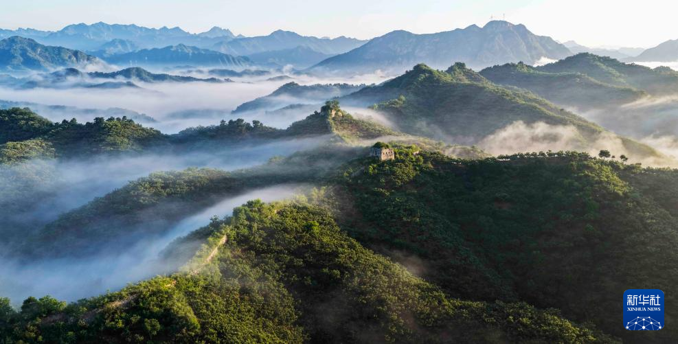 7月13日清晨,雨后的河北省遵化市境内洪山口古长城云蒸霞蔚,古长城、云海、山峦浑然一体,壮美如画(无人机照片)。