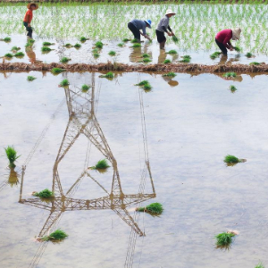 7月13日,湖南省衡阳市衡东县霞流镇农民在抢插晚稻(无人机照片)。