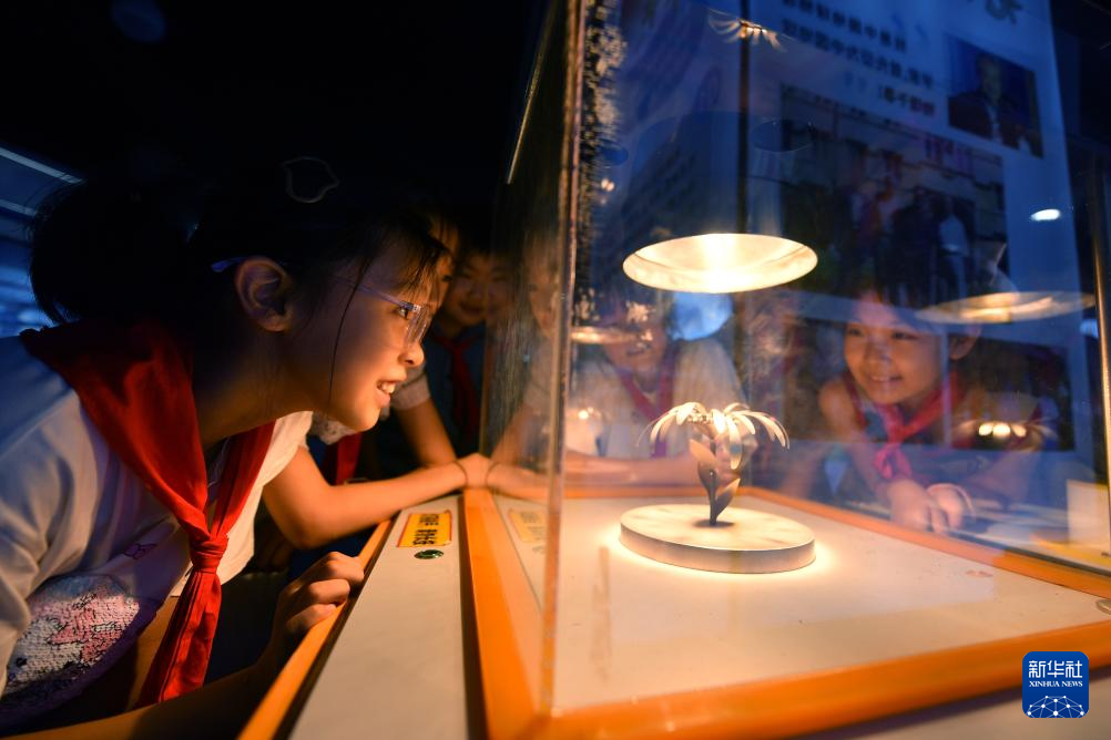 7月13日,山东省青岛市市北区桦川路小学学生在青岛科技馆体验“记忆合金”科普装置。
