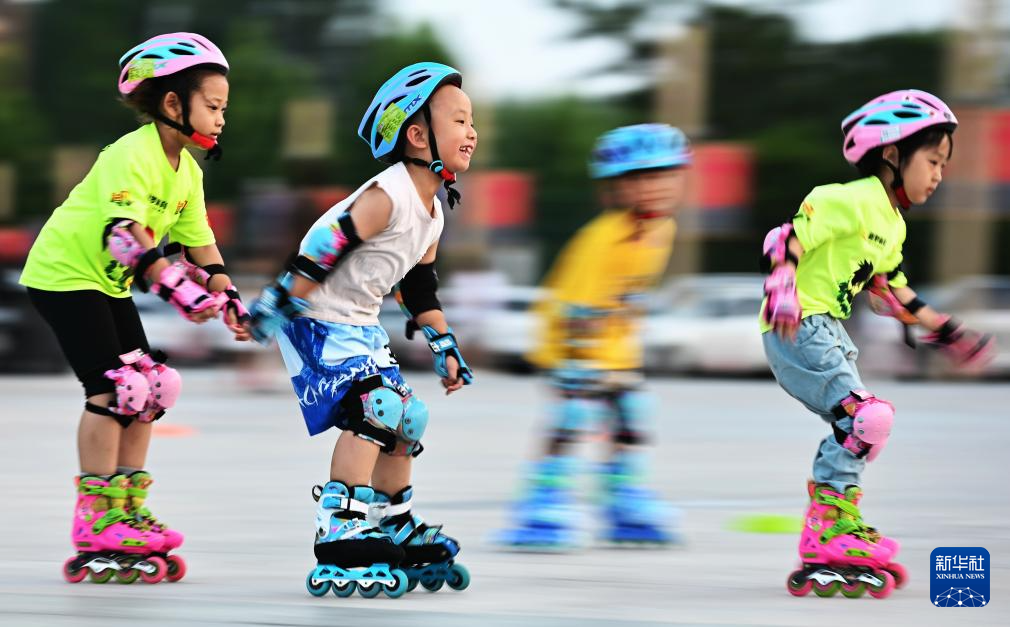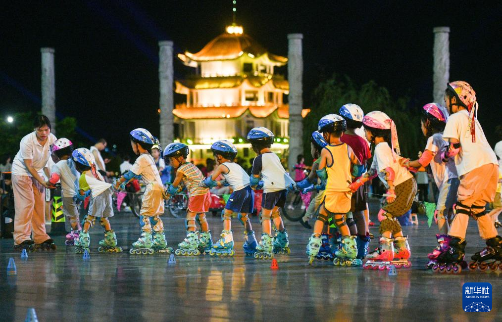 7月12日,在湖南省永州市道县周敦颐广场,孩子们在老师的指导下学习轮滑。