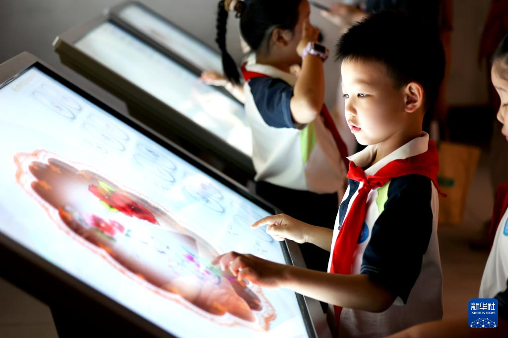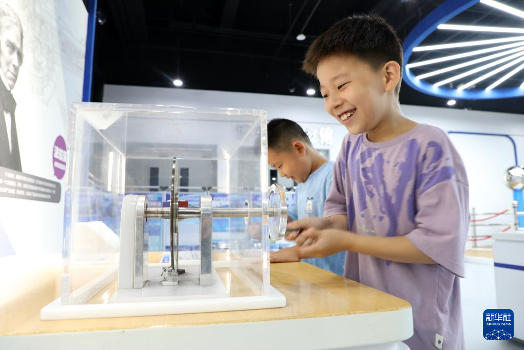 7月13日,在山东省滨州市博兴县科技馆,小学生在体验科普装置。