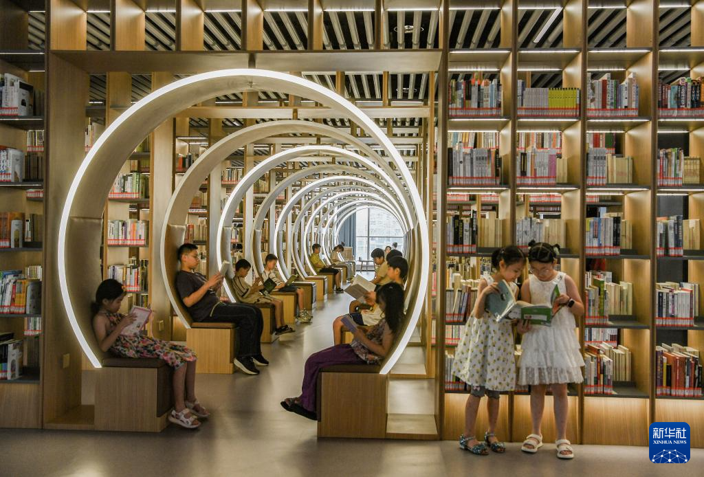7月13日,学生在浙江省金华市金东区图书馆“时光隧道”长廊书架阅读图书。
