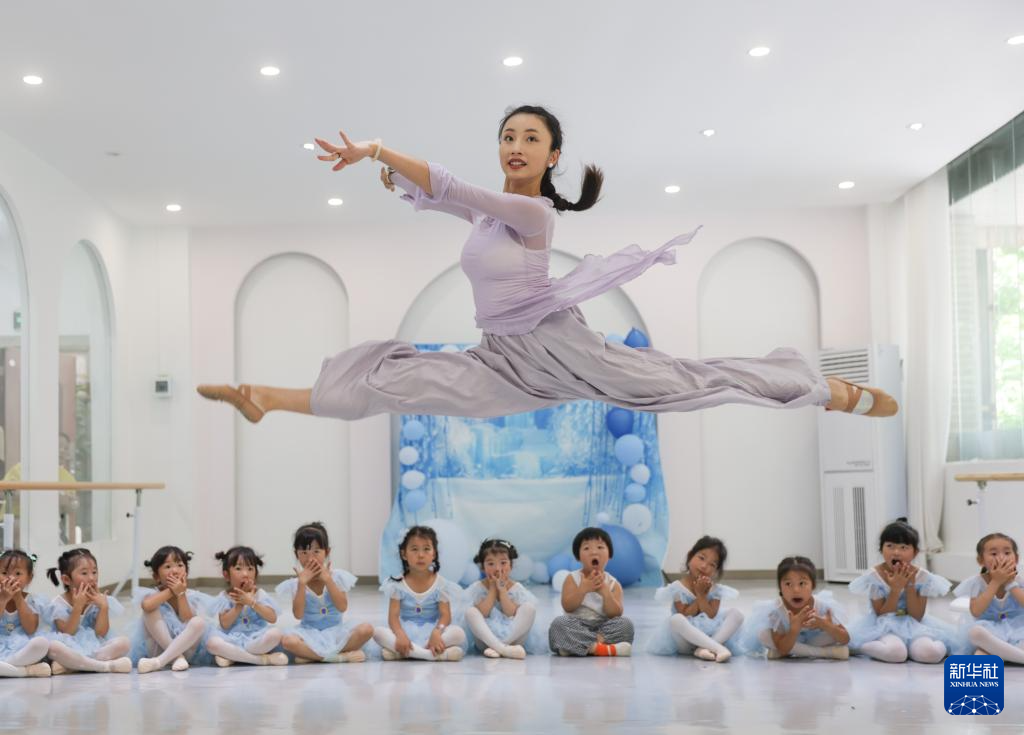 7月13日,在贵州省开阳县一家舞蹈培训机构,一名老师为孩子们展示舞蹈动作。