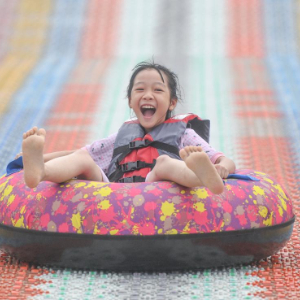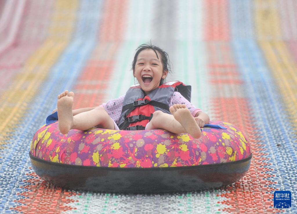 7月12日,在湖南省永州市道县一水上乐园,小朋友在体验彩虹滑道。