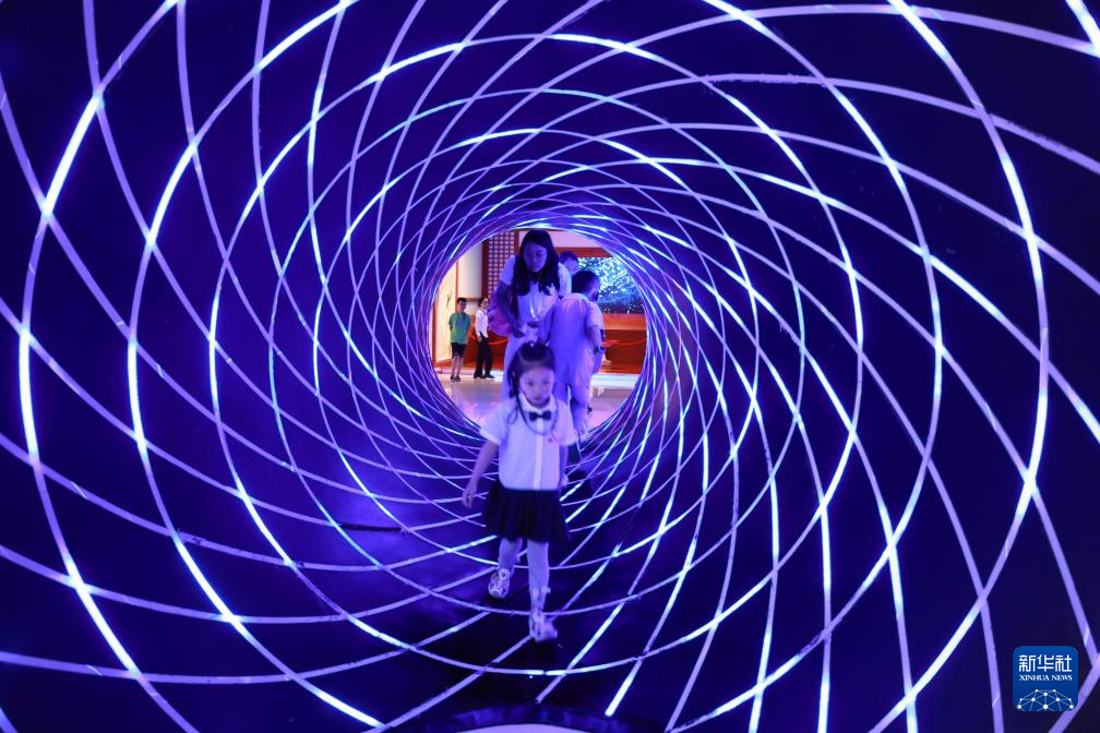 7月13日,一名孩子在贵州省平塘县天文小镇平塘国际天文体验馆体验穿越“黑洞”。