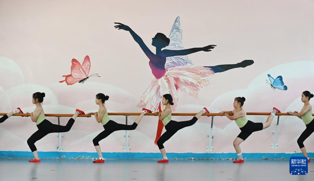 7月13日,在山东省滕州市一家舞蹈培训机构,孩子们在练习舞蹈基本功。