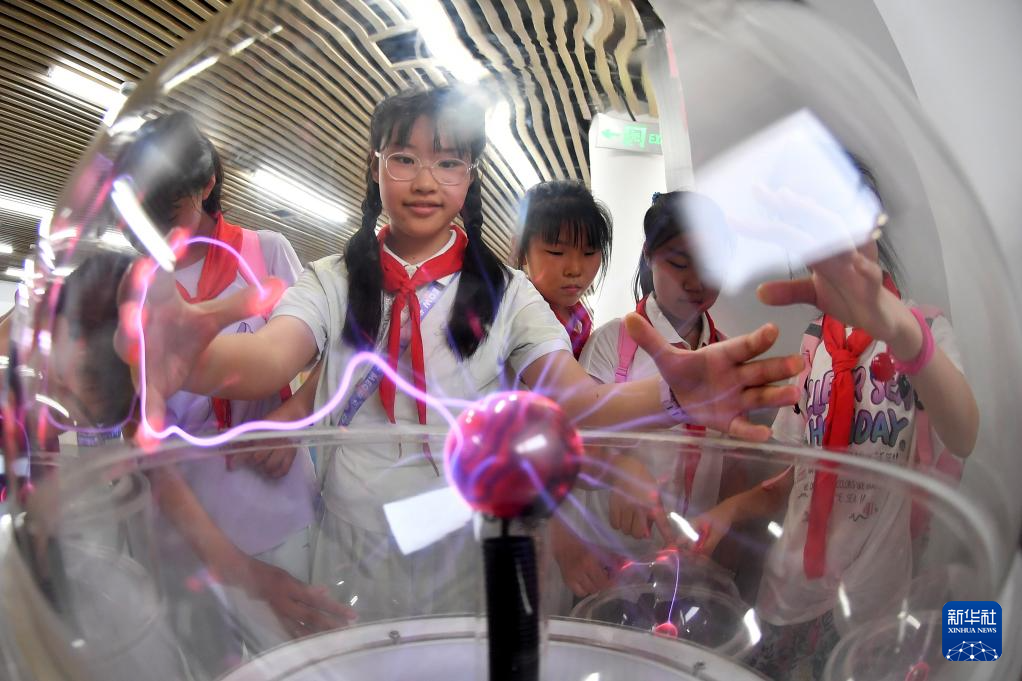 7月13日,山东省青岛市市北区桦川路小学学生在青岛科技馆体验“辉光球”科普装置。