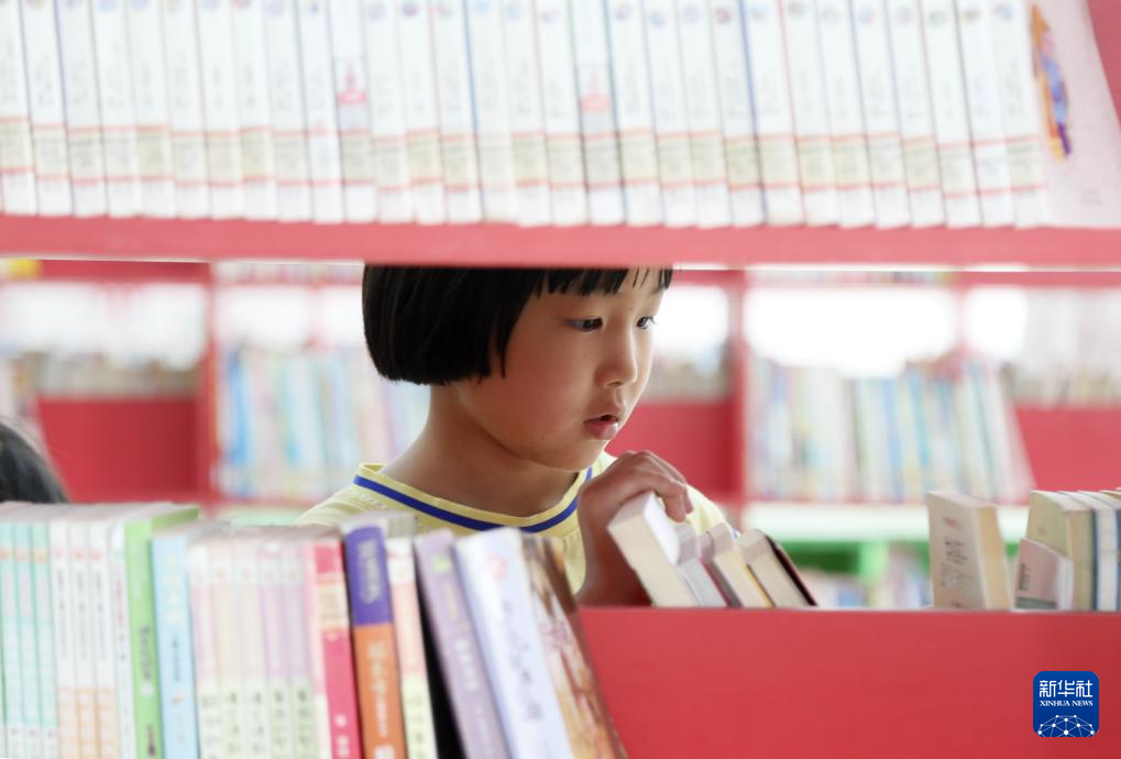 7月12日,在河南省洛阳市汝阳县图书馆少儿阅览室,一名小学生挑选图书。