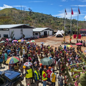 9月29日,在巴布亚新几内亚东高地省首府戈罗卡市,当地民众庆祝中国援巴布亚新几内亚菌草旱稻项目永久性示范基地落成。