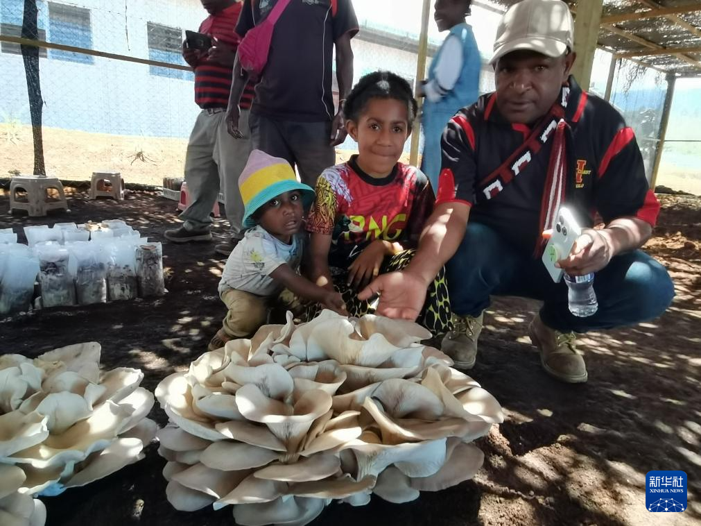 9月29日,在巴布亚新几内亚东高地省首府戈罗卡市,当地民众参观中国援巴布亚新几内亚菌草旱稻项目永久性示范基地种植的大平菇。
