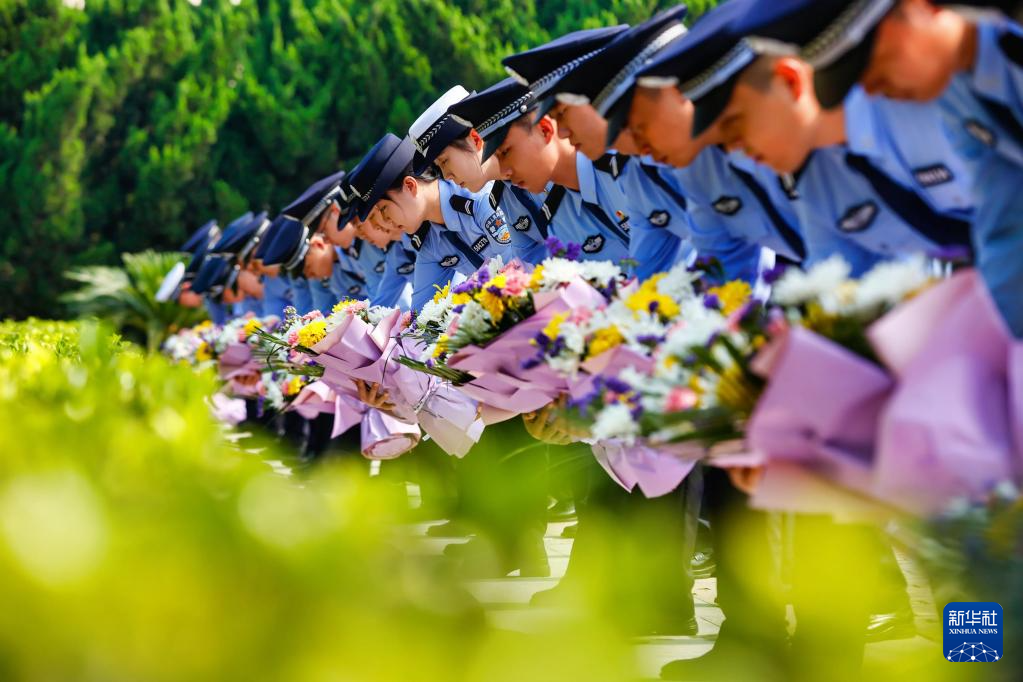 9月30日,民警在天津市滨海新区塘沽烈士陵园献花。