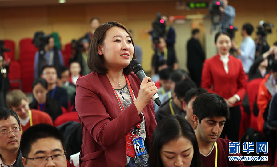10月22日,十九大新聞中心在梅地亞中心二層新聞發(fā)布廳舉辦集體采訪活動(dòng),主題為“中國(guó)特色強(qiáng)軍之路邁出堅(jiān)定步伐”。圖為中國(guó)國(guó)際廣播電臺(tái)記者提問(wèn)。新華網(wǎng) 郝廣鵬攝