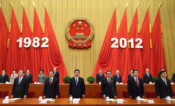 ??? 12月4日,首都各界在北京人民大會堂集會,隆重紀念現(xiàn)行憲法公布施行三十周年。習(xí)近平、吳邦國、李克強、張德江、俞正聲、劉云山等出席大會。新華社記者蘭紅光攝