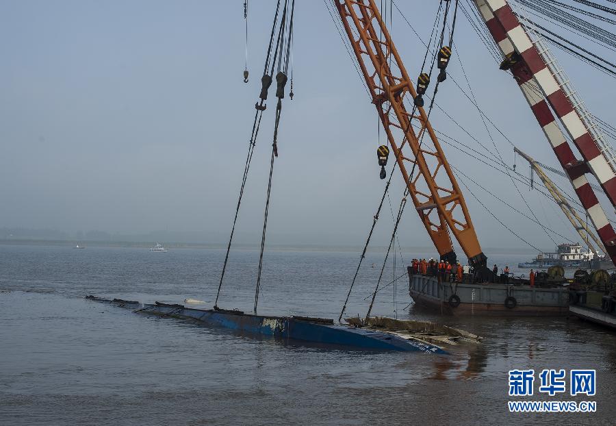??? 6月5日,救援人員正在進行整體扶正打撈工作。記者在“東方之星”沉船施救現(xiàn)場看到,當(dāng)天7時40分,“東方之星”船體已側(cè)翻過來,露出“東方之星”四個大字,藍色的船體也已露出水面。在整整一個晚上的緊張準備后,當(dāng)天7時許,“東方之星”扶正作業(yè)開始推進。 新華社記者 肖藝九 攝
