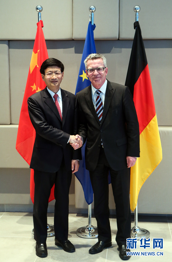新華社照片,柏林,2015年6月30日 (XHDW)孟建柱會見德國內(nèi)政部長德邁齊埃 6月29日,習近平主席特使、中共中央政治局委員、中央政法委書記孟建柱(左)在德國首都柏林會見德國內(nèi)政部長德邁齊埃。 新華社記者張帆攝