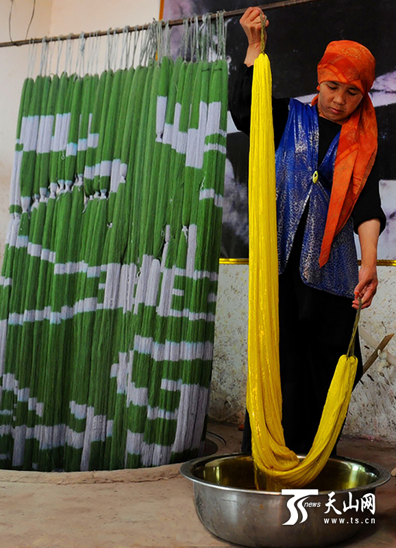 而今,這種技法漸漸被注入新鮮血液。6月底,當(dāng)記者走進吉亞鄉(xiāng)喀了塔吐格曼村家庭作坊,在院子里看見正在染色的艾比比班 卡斯木。一蘸、一染、一擰、一轉(zhuǎn),一套動作下來就能浸染一小段艾德萊斯了,有了現(xiàn)成的絲線和染料后,這項神秘扎染技藝顯得更加快捷了,村民們也樂于接受這種高效的生產(chǎn)模式。