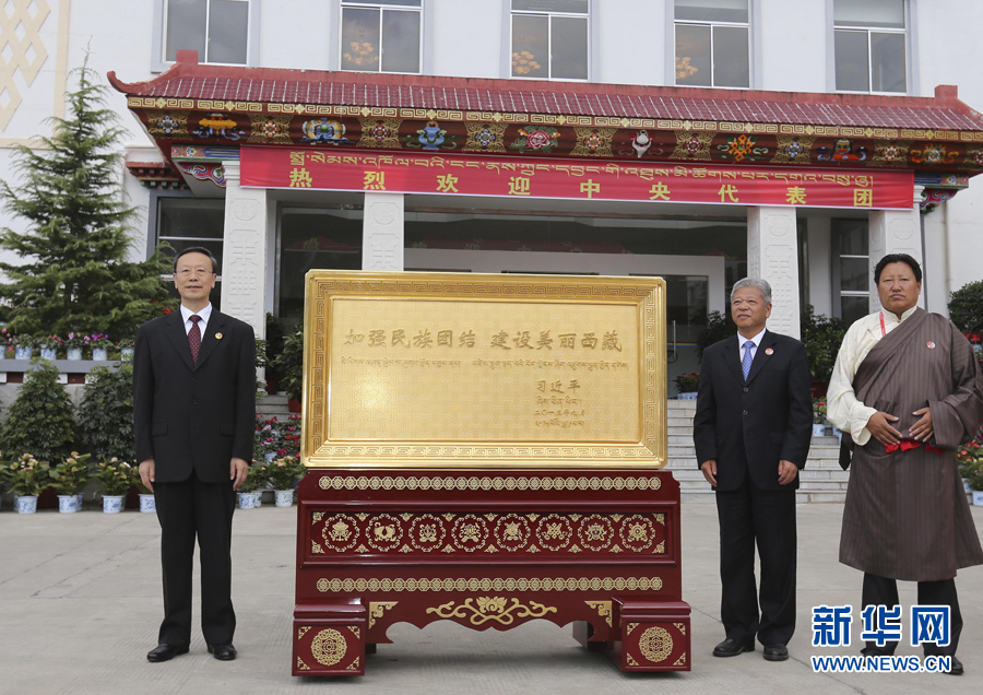 ??? 9月9日至10日,中央書記處書記、全國政協(xié)副主席、中央代表團(tuán)副團(tuán)長杜青林率林芝分團(tuán),帶著以習(xí)近平同志為總書記的黨中央對西藏各族人民的深切關(guān)懷和全國人民的美好祝福,看望慰問當(dāng)?shù)馗髯甯刹咳罕姟_@是9月10日,杜青林向林芝市贈送習(xí)近平總書記題詞“加強(qiáng)民族團(tuán)結(jié) 建設(shè)美麗西藏”賀匾。 新華社記者丁林?jǐn)z