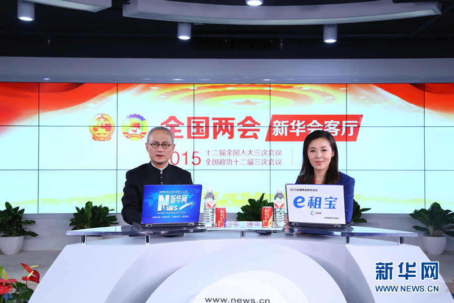 ??? 2015年3月14日,全國(guó)人大代表、鳳凰古城文化旅游投資股份有限公司董事長(zhǎng)葉文智做客新華會(huì)客廳。圖為嘉賓與主持人合影。新華網(wǎng) 李江 攝