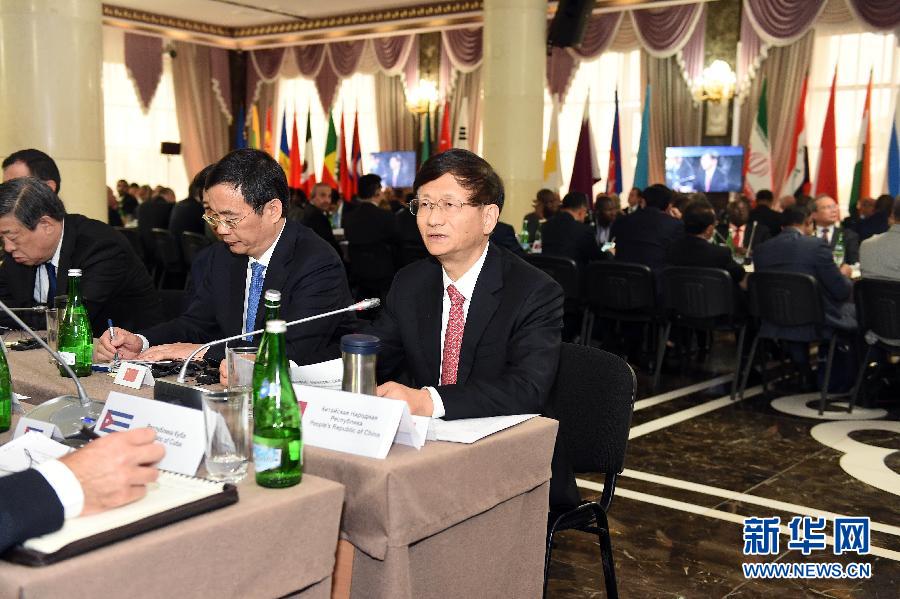 ??? 5月24日,在俄羅斯車臣共和國(guó)首府格羅茲尼,中共中央政治局委員、中央政法委書記孟建柱(前右一)在第七屆安全事務(wù)高級(jí)代表國(guó)際會(huì)議上發(fā)言。中共中央政治局委員、中央政法委書記孟建柱24日在俄羅斯車臣出席第七屆安全事務(wù)高級(jí)代表國(guó)際會(huì)議。來自70余個(gè)國(guó)家和國(guó)際組織的代表就深化國(guó)際安全合作、有效應(yīng)對(duì)恐怖主義等問題進(jìn)行探討。新華社發(fā)(郝帆攝)