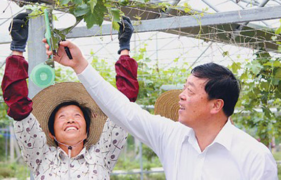 武繼軍(右)在查看村里的農業(yè)科技示范園。