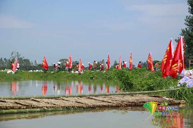 團旗在堤壩上飄揚。中國青年網(wǎng)記者 周學(xué)磊 攝