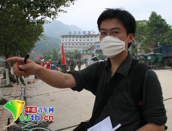 2008年5月13日,孫鐵翔在北川縣城進(jìn)行抗震救災(zāi)采訪報(bào)道。本人供圖