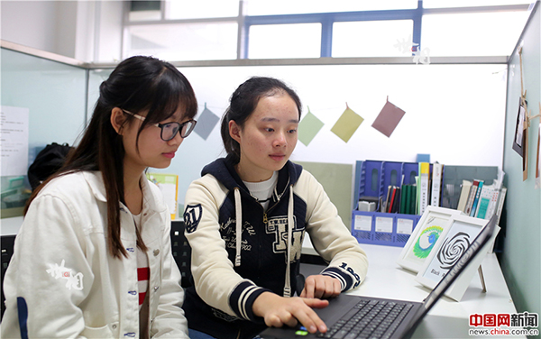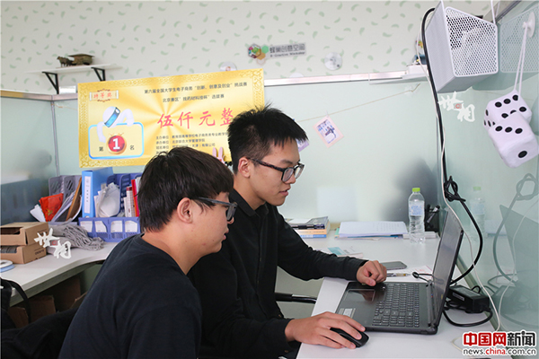 陳騫正與付家玉討論下一步產(chǎn)品在校內(nèi)的推廣宣傳方案。