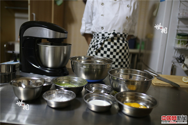 陳騫通過自己課余時(shí)間打工掙錢,再加上父母的一些支持資助,購(gòu)買了電動(dòng)打蛋器、烤箱、冰箱等器具。圖為烘焙制作前的材料準(zhǔn)備。