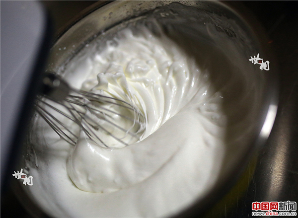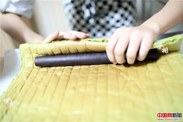 陳騫要求每一道工序都要精心制作,這樣蛋糕才能達(dá)到理想中的口味。圖為陳騫用篩子將綠茶粉均勻撒入甜點(diǎn)原料中。