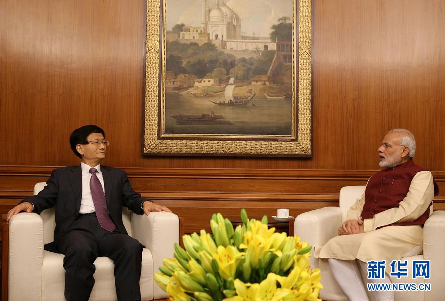 ????11月9日,印度總理莫迪(右)在新德里會(huì)見(jiàn)到訪的習(xí)近平主席特使、中共中央政治局委員、中央政法委書(shū)記孟建柱。 新華社記者李明攝