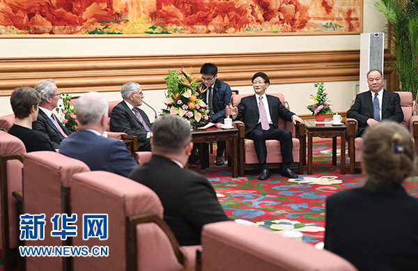 11月25日,中共中央政治局委員、中央政法委書記孟建柱在北京會見中英法治圓桌會議英方代表。 新華社記者謝環(huán)馳攝