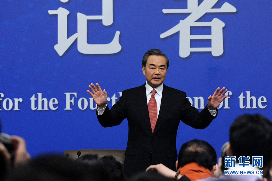 十二屆全國人大四次會議新聞中心于3月8日(星期二)10時在梅地亞中心多功能廳舉行記者會,邀請外交部部長王毅就“中國的外交政策和對外關系”的相關問題回答中外記者的提問。圖為外交部部長王毅與記者打招呼。新華網發(fā) 陳競超攝