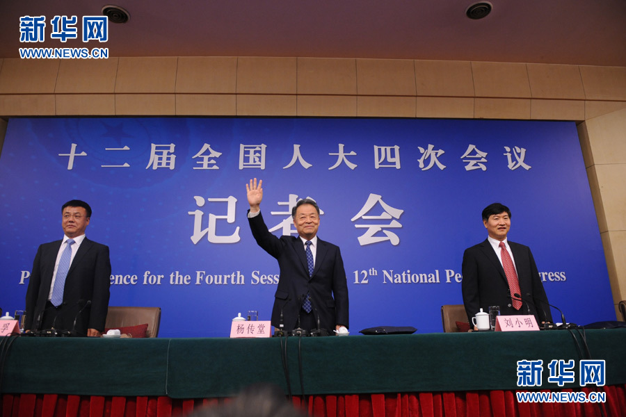 十二屆全國(guó)人大四次會(huì)議新聞中心于3月14日(星期一)10時(shí)在梅地亞中心多功能廳舉行記者會(huì),邀請(qǐng)交通運(yùn)輸部部長(zhǎng)楊傳堂、交通運(yùn)輸部運(yùn)輸服務(wù)司司長(zhǎng)劉小明、北京交通發(fā)展研究中心主任郭繼孚就“深化出租汽車改革與發(fā)展”的相關(guān)問題回答中外記者的提問。圖為楊傳堂、劉小明、郭繼孚到達(dá)會(huì)場(chǎng),楊傳堂向記者揮手致意。新華網(wǎng)/中國(guó)政府網(wǎng) 陳杰 攝?
