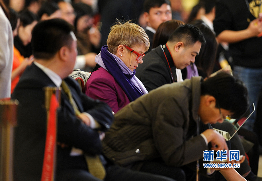 3月16日上午,國(guó)務(wù)院總理李克強(qiáng)在人民大會(huì)堂三樓金色大廳會(huì)見(jiàn)采訪十二屆全國(guó)人大四次會(huì)議的中外記者并回答記者提出的問(wèn)題。圖為早早趕到記者會(huì)現(xiàn)場(chǎng)的各路媒體記者。新華網(wǎng)/中國(guó)政府網(wǎng) 陳競(jìng)超 攝