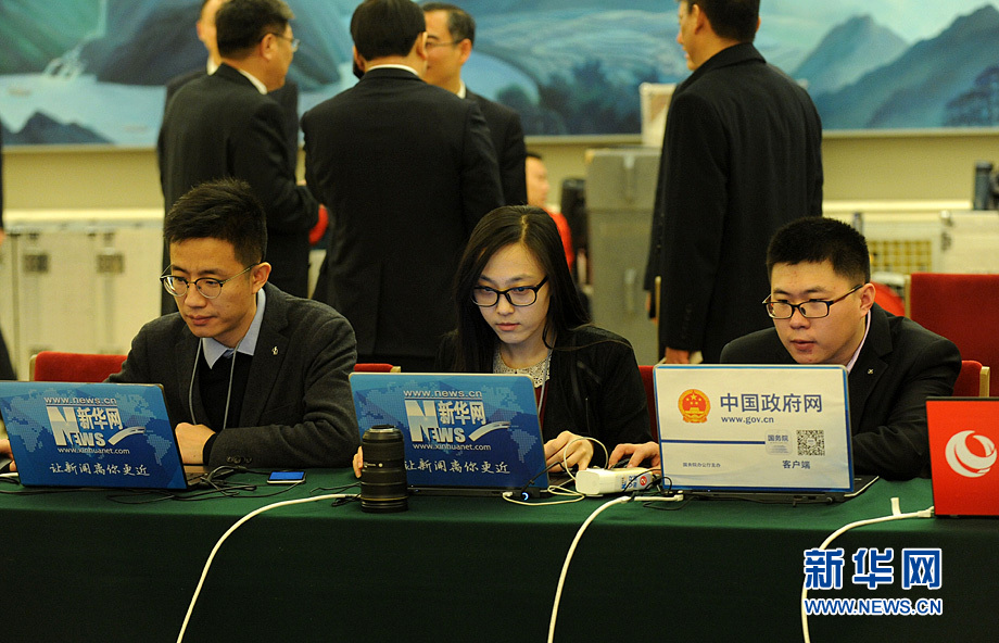 3月16日上午,國務(wù)院總理李克強(qiáng)在人民大會堂三樓金色大廳會見采訪十二屆全國人大四次會議的中外記者并回答記者提出的問題。圖為新華網(wǎng)、中國政府網(wǎng)記者在做直播準(zhǔn)備。新華網(wǎng)/中國政府網(wǎng) 陳競超 攝