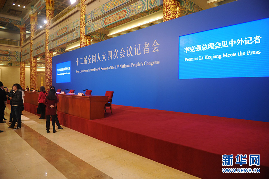 3月16日上午,國務(wù)院總理李克強(qiáng)在人民大會堂三樓金色大廳會見采訪十二屆全國人大四次會議的中外記者并回答記者提出的問題。圖為會前現(xiàn)場。 新華網(wǎng)/中國政府網(wǎng) 陳杰攝