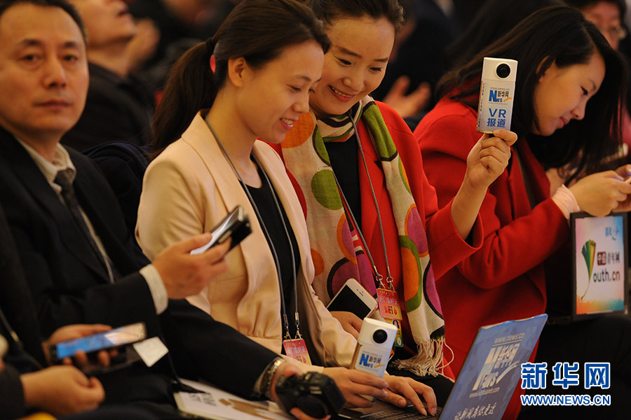 3月16日上午,國(guó)務(wù)院總理李克強(qiáng)在人民大會(huì)堂三樓金色大廳會(huì)見(jiàn)采訪十二屆全國(guó)人大四次會(huì)議的中外記者并回答記者提出的問(wèn)題。圖為新華網(wǎng)記者用VR報(bào)道總理記者會(huì)現(xiàn)場(chǎng)。新華網(wǎng)/中國(guó)政府網(wǎng) 陳杰攝