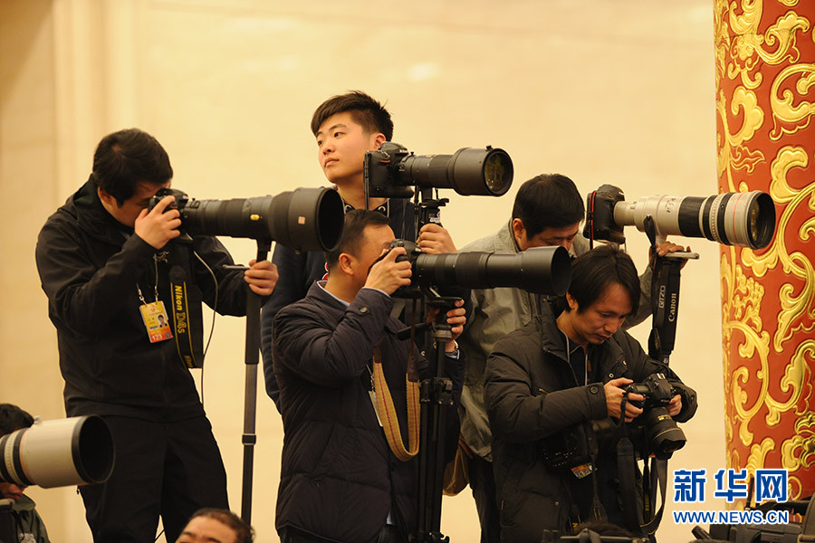 3月16日上午,國務院總理李克強在人民大會堂三樓金色大廳會見采訪十二屆全國人大四次會議的中外記者并回答記者提出的問題。圖為記者會一角的攝影記者。新華網(wǎng)/中國政府網(wǎng) 陳杰攝