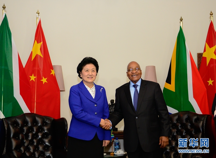 4月25日,南非總統(tǒng)祖馬(右)在比勒陀利亞總統(tǒng)官邸會(huì)見(jiàn)正在對(duì)南非進(jìn)行正式訪問(wèn)并出席中南高級(jí)別人文交流機(jī)制首次會(huì)議的中國(guó)國(guó)務(wù)院副總理劉延?xùn)|。 新華社記者 翟健嵐 攝