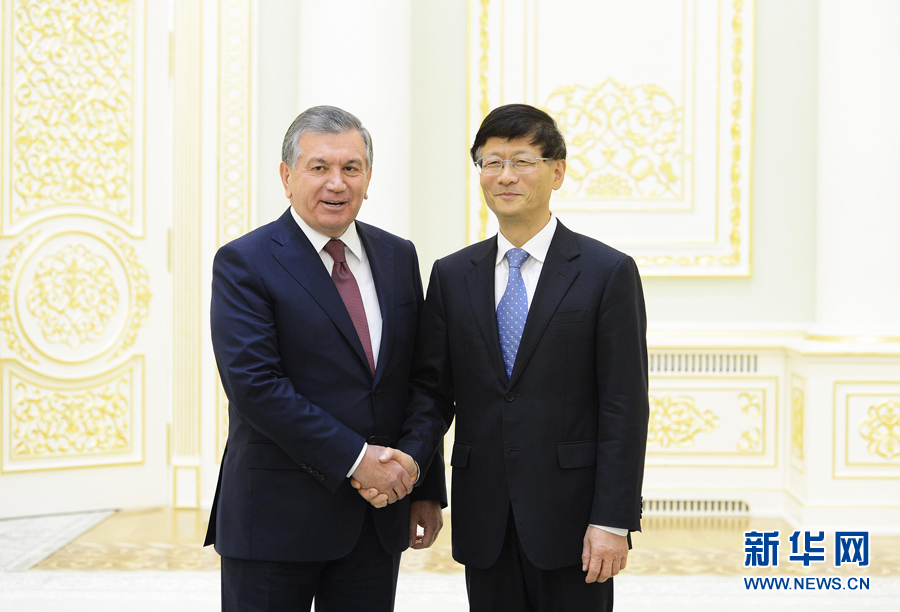 9月9日,中共中央政治局委員、中央政法委書記、中國和烏茲別克斯坦政府間合作委員會中方主席孟建柱(右)在塔什干會見烏總統(tǒng)米爾濟(jì)約耶夫。 新華社記者沙達(dá)提攝