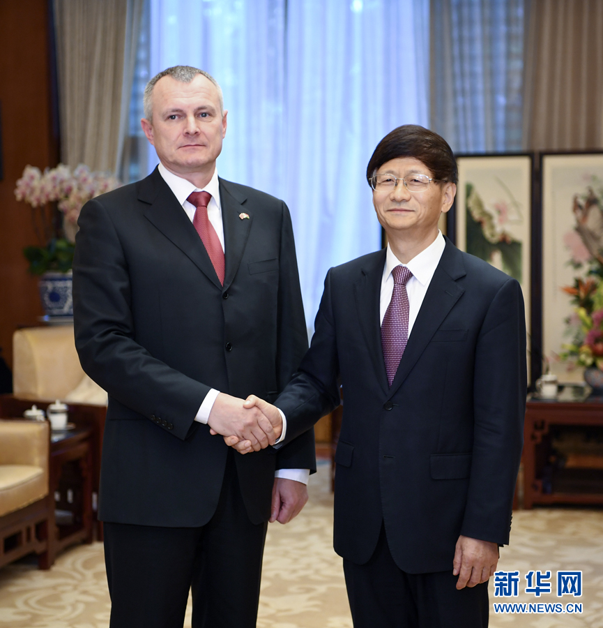 9月26日,中共中央政治局委員、中央政法委書記孟建柱在北京會見來華出席國際刑警組織第86屆全體大會的白俄羅斯內(nèi)務(wù)部長舒涅維奇。新華社記者 張領(lǐng) 攝