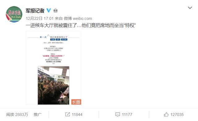 @你看鄰居家的:我在柳州站見過,大概是幾百名士兵退役,車還沒到,都把東西碼好,排排坐著,在地上等車。那一刻我才理解,他們不是讓座這么簡單,他們是根本沒想過要坐。