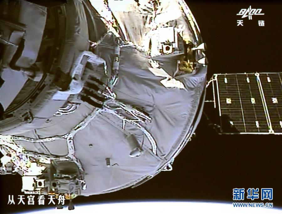 4月22日,北京航天飛行控制中心大廳大屏幕顯示天舟一號與天宮二號自動交會對接畫面。這是天舟一號與天宮二號進(jìn)行的首次自動交會對接,也是我國自主研制的貨運(yùn)飛船與空間實(shí)驗(yàn)室的首次交會對接。(新華社發(fā)王泗江 攝)