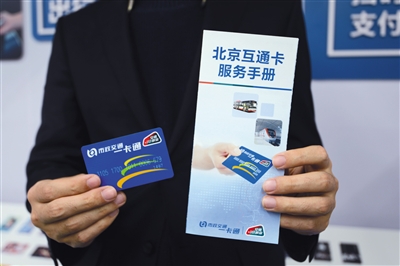 昨日,工作人員在展示京津冀互通卡?;ネ嬗疑辖怯∮小敖煌?lián)合”標(biāo)識。 北京市政交通一卡通有限公司供圖