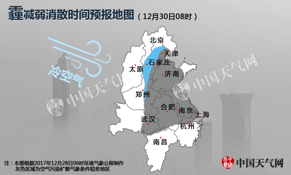 ??本次霾(2017年12月28日-30日)過(guò)程減弱消散預(yù)報(bào)圖。(稿件內(nèi)圖片來(lái)源:新華社、中國(guó)天氣網(wǎng)、視覺(jué)中國(guó))