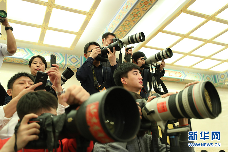 3月15日上午,國(guó)務(wù)院總理李克強(qiáng)在人民大會(huì)堂三樓金色大廳會(huì)見(jiàn)采訪十二屆全國(guó)人大五次會(huì)議的中外記者并回答記者提出的問(wèn)題。圖為記者在現(xiàn)場(chǎng)拍攝。新華網(wǎng)/中國(guó)政府網(wǎng) 翟子赫 攝?