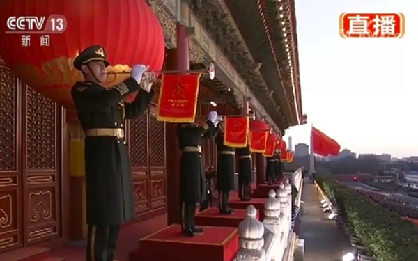 由軍樂團八名禮號手在天安門城樓演奏《升旗號角》音樂,增加了升旗儀式的神圣感與儀式感。八名禮號手經(jīng)過嚴格挑選,從技術(shù)到體貌都是最優(yōu)秀的,未來一年基本不會輪換。