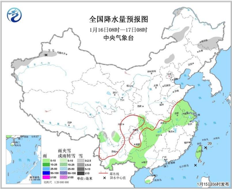 全國降水量預(yù)報圖(1月15日08時-16日08時)
