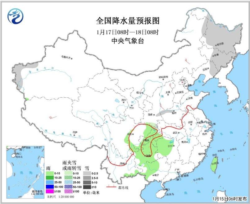 全國降水量預(yù)報圖(1月17日08時-18日08時)